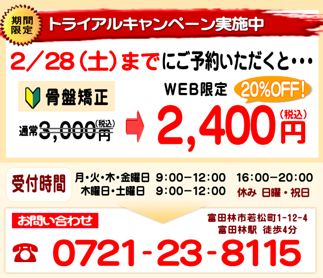富田林市若松町にあります「とんだばやし整骨院」では整体、ゆがみ無痛矯正、鍼灸治療など幅広い施術をおこなっております。