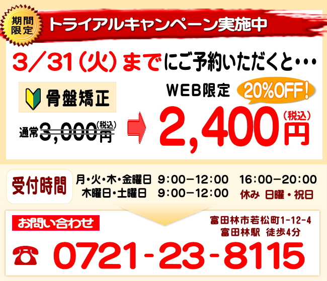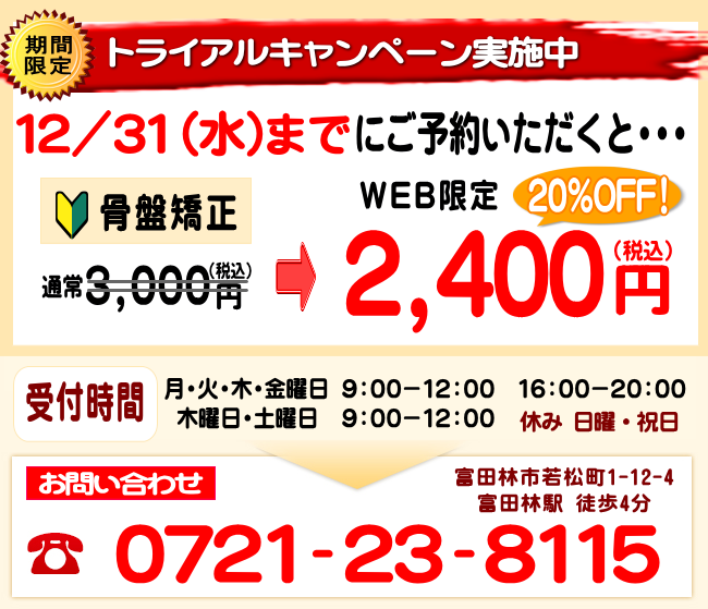 富田林市若松町にあります「とんだばやし整骨院」では整体、ゆがみ無痛矯正、鍼灸治療など幅広い施術をおこなっております。
