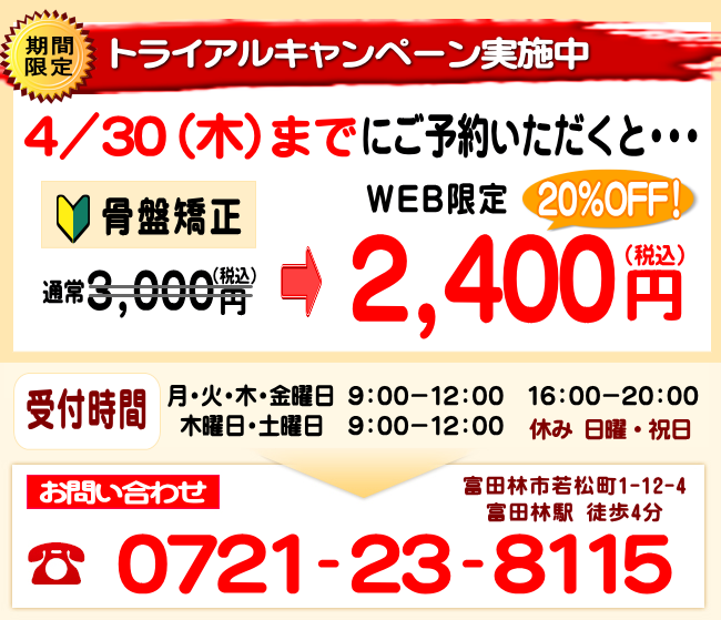 富田林市若松町にあります「とんだばやし整骨院」では整体、ゆがみ無痛矯正、鍼灸治療など幅広い施術をおこなっております。
